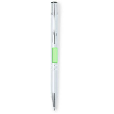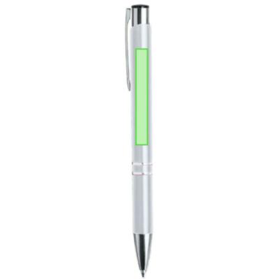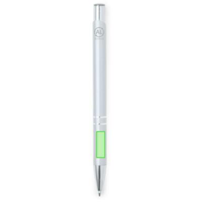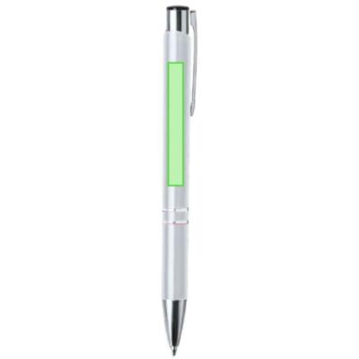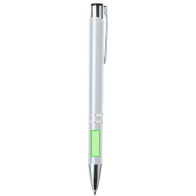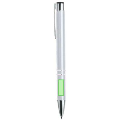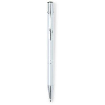 Bolígrafo de mecanismo pulsador fabricado en aluminio. Incluye accesorios plateados y clip, pulsador y punta a juego.En tinta negra.