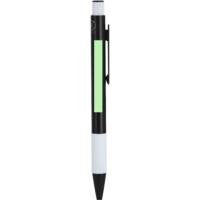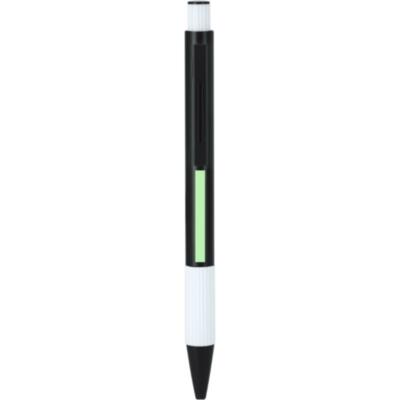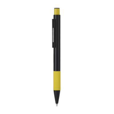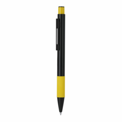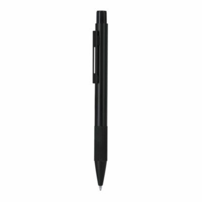 Bolígrafo con cuerpo en Aluminio Reciclado. Empuñadura acabado gomoso con textura. De mecanismo pulsador, de cartucho jumbo y con tinta azul. Incluye distintivo Aluminio reciclado.