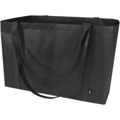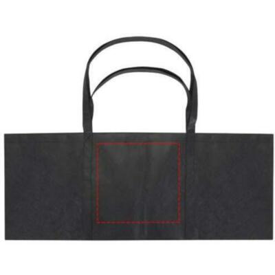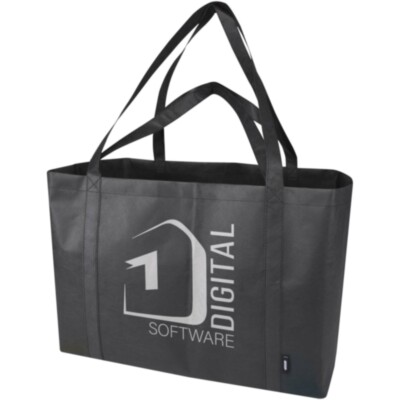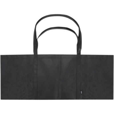 Fabricada con RPET no tejido duradero y resistente al desgarro, la bolsa Tote "Jumbo" con certificado GRS ofrece una capacidad extra de hasta 65 litros para diversas actividades, como hacer la compra o pasar un día en la playa o en el parque. Dispone de asas cortas reforzadas (24 cm) y largas (37 cm) para una máxima comodidad de transporte. Fácil de plegar y guardar cuando no se utiliza. Resistencia para hasta 15 kg de peso.