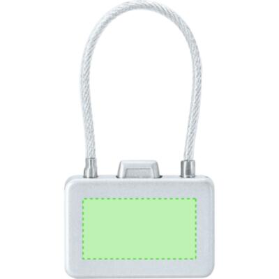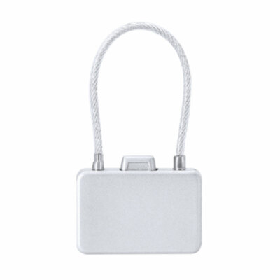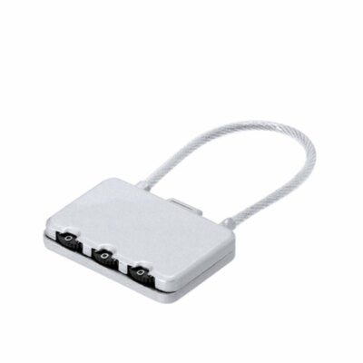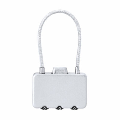 Candado con contraseña numérica metálico de 3 dígitos, botón de apertura en la parte superior y cierre de cable de acero.