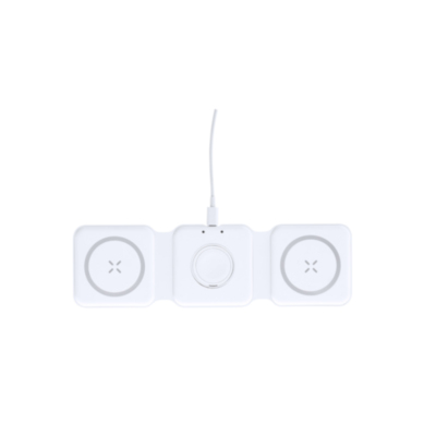 Completo cargador inalámbrico magnético 15W, diseñado para la carga simultánea del smartphone, auriculares y smartwatch. Un gadget todo en uno: plegable, portátil, de tamaño compacto, muy versátil y de diseño funcional. Conexión por usb Tipo C -cable incluido- y elaborado en resistente ABS de color blanco. Fabricado conforme a los estándares RoHS y en cumplimiento con los siguientes requisitos de seguridad:Sistema de protección contra sobrecalentamiento.Sistema de protección contra sobrecarga.Sistema de bloqueo para evitar cortocircuitos.