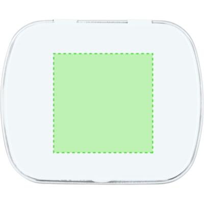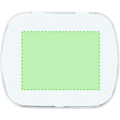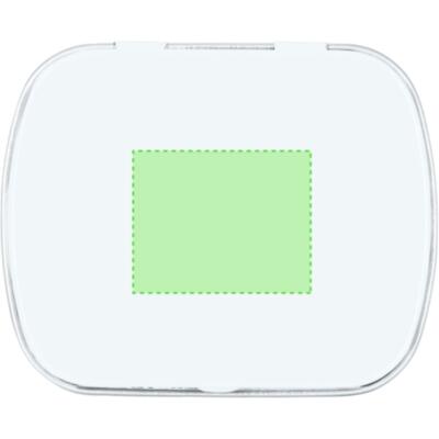 Dispensador de caramelos de menta sin azúcar de 23 gr. En caja de metal con sistema de apertura de bisagra.