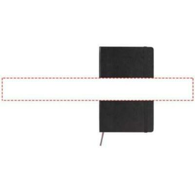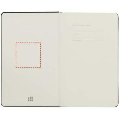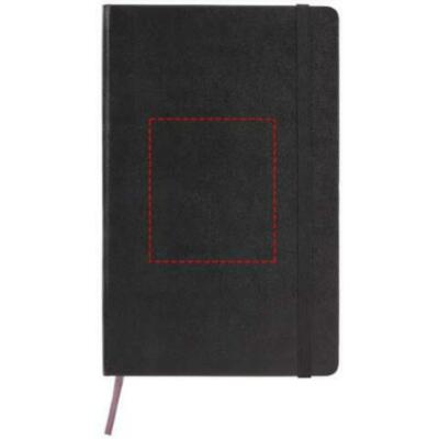 Libreta grande "Moleskine Classic" de tapa dura en negro (más vendido), además de en una gama de colores intensos y elegantes. Presenta esquinas redondeadas, cierre elástico y cinta marcapáginas. Bolsillo extensible en cartón y tela en el interior de la contraportada. Contiene 240 páginas cuadriculadas de color marfil.