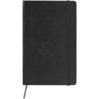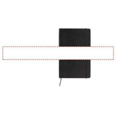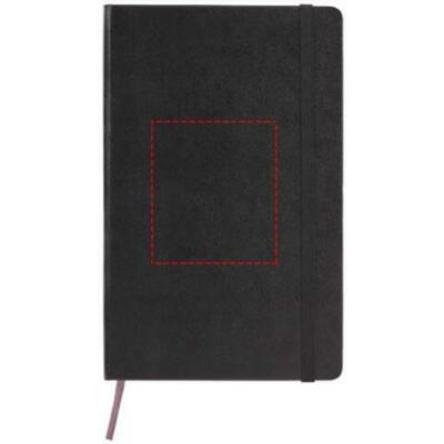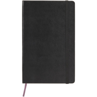 Libreta grande "Moleskine Classic" de tapa dura en negro (más vendido), además de en una gama de colores intensos y elegantes. Presenta esquinas redondeadas, cierre elástico y cinta marcapáginas. Bolsillo extensible en cartón y tela en el interior de la contraportada. Contiene 240 páginas punteadas de color marfil.