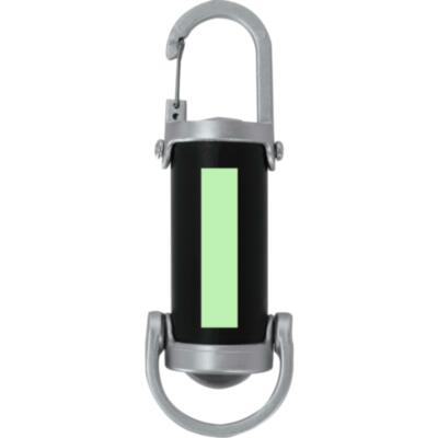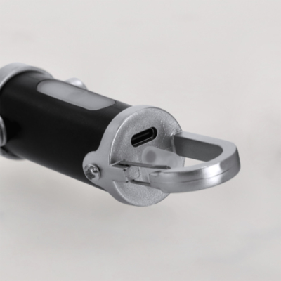 Linterna fabricada en ABS con mosquetón de transporte. 4 LEDs, sistema de encendido de botón y 8 luces COB. 7 posiciones de luz fija e intermitente. Práctica asa de transporte en parte inferior. Batería recargable de 400mAh, con cable de carga Tipo C incluido de 5V.