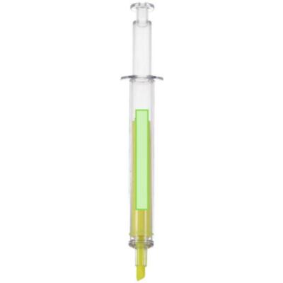 Original marcador con diseño de jeringuilla y cuerpo transparente. De tinta amarillo fluorescente.