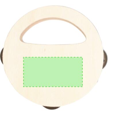 Pandereta de madera. De forma circular con práctica asa para un fácil agarre y 3 platillos dobles metálicos. Con amplia superficie de impresión. Elaborado con elementos vegetales para así fomentar la utilización de materias primas naturales y reducir las emisiones contaminantes.