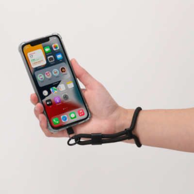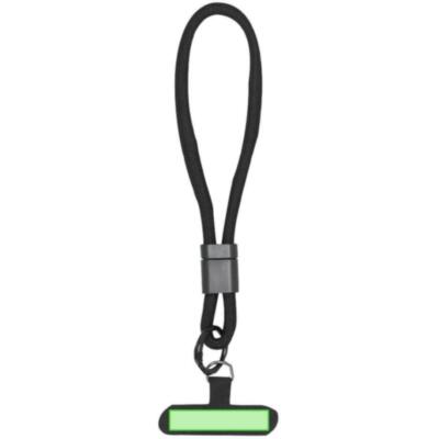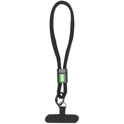 Pulsera soporte fabricada en suave poliéster. Accesorio de transporte para situar entre la funda y el smartphone, con accesorio plástico para ajuste en muñeca.