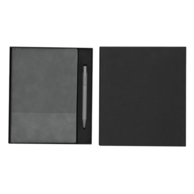 Set de bloc de notas y bolígrafo fabricados en PU Reciclado y Aluminio Reciclado. El set incluye: - Bloc de notas fabricado en PU Reciclada, con tapas flexibles . Incluye 96 páginas de color crema con líneas, un marcapáginas a juego. Con distintivo PU Reciclada. - Bolígrafo de aluminio reciclado, con cuerpo en acabado caucho. Dispone de clip mecanismo pulsador y tinta azul. Incluye distintivo de aluminio reciclado.