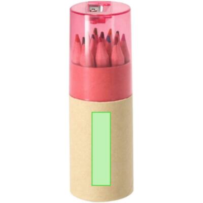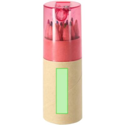 Set de 12 lápices de madera, con cuerpo hexagonal y minas en varios colores. Presentados en estuche cilíndrico de cartón reciclado, con capucha transparente y sacapuntas integrado.