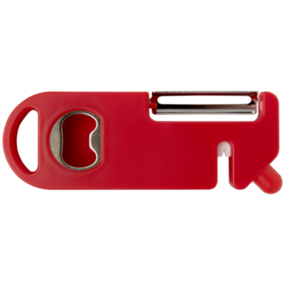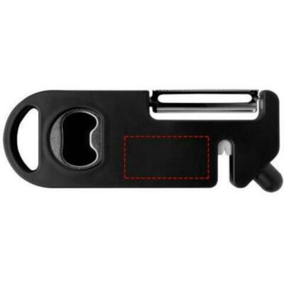 Este utensilio de cocina multiusos combina cuatro funciones esenciales en un diseño compacto. Fabricado con plástico reciclado, cuenta con pelador, abridor de botellas, afilador de cuchillos y una punta puntiaguda para eliminar las marcas de las patatas. Cuenta con un orificio para colgar que permite guardarlo fácilmente. Práctico y compacto, es un utensilio versátil que no puede faltar en casa.