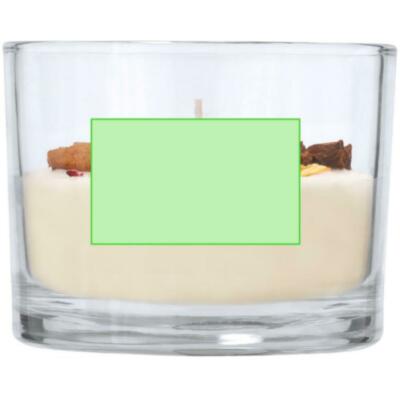 Vela aromática elaborada con cera vegetal y aroma de canela y cítricos. Con pétalos de flor rosa, rama de canela, rodajas de naranja seca y anís estrellado como elementos decorativos en la parte superior.
