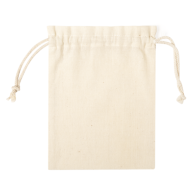 Bolsita de línea nature en material 100% algodón de 105g/m2. Tamaño 15x21 cm, de acabado cosido y con cordones autocierre de algodón.