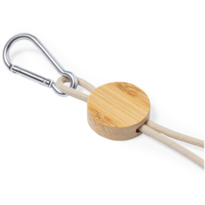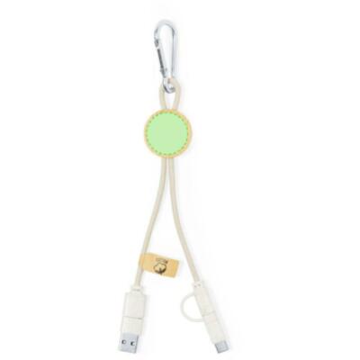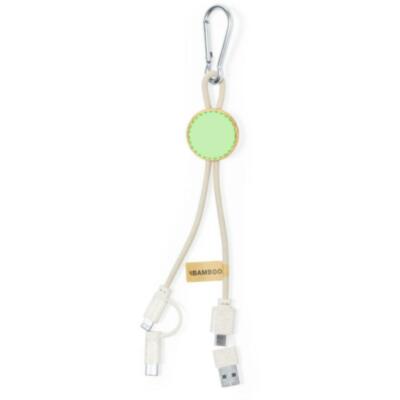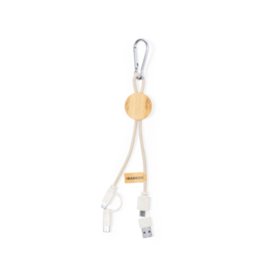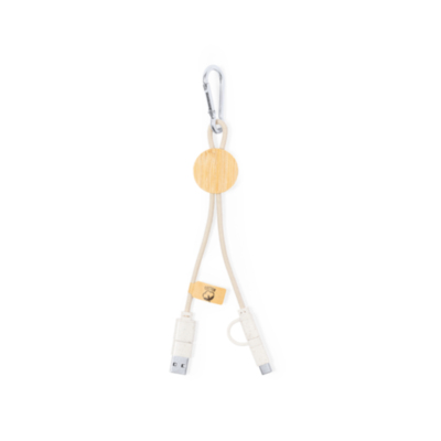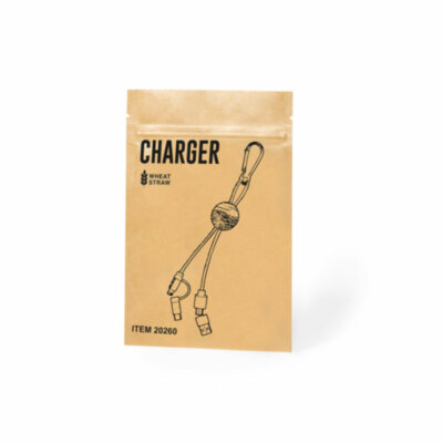 Cable cargador con mosquetón de transporte. Fabricado usando materiales naturales y respetuosos con el medio ambiente:Pieza central en bambú natural.Cables recubiertos de algodón, incluyen conexiones de entrada Tipo C y USB, salidas Lightning, Micro USB y Tipo C. 5V DC 2.4A.Presentado en bolsa individual de diseño kraft. Poner que lleva distintivo en hangtag de bambú y algodón kraft.Elaborado con elementos vegetales para así fomentar la utilización de materias primas naturales y reducir las emisiones contaminantes.