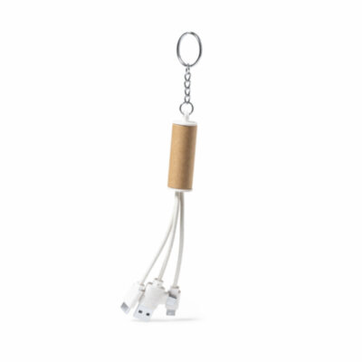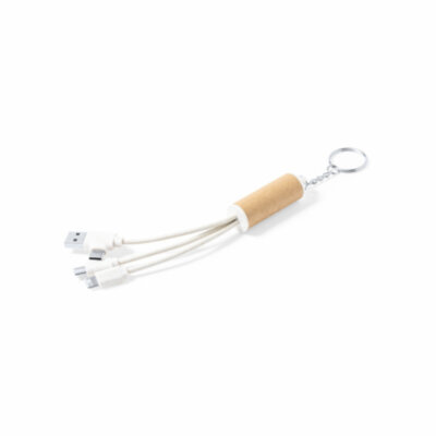 Cable cargador USB de línea nature, fabricado en combinación de cartón reciclado y caña de trigo, para así fomentar la utilización de materias primas naturales y reducir las emisiones contaminantes. Con conexiones USB, Tipo C y dual micro USB-Lightning. Con anilla/llavero para fácil transporte y zona lisa para marcaje. Presentado en bolsa individual autocierre de acabado kraft y diseño eco.