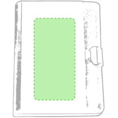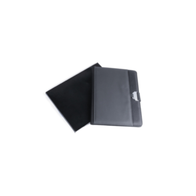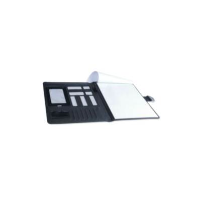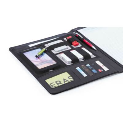 Carpeta tecnológica en elegante combinación de poliéster y suave polipiel. con original cierre metálico. Interior con compartimentos para memoria USB, powerbank, compartimento táctil para smartphone, tarjeteros y soporte para bolígrafo. Con bloc de notas extraíble de 20 hojas a una raya y presentada en elegante caja negra.