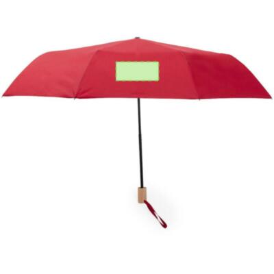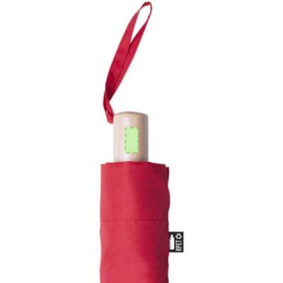 Paraguas plegable de línea nature de 95cm de diámetro. En material pongee 190T RPET, elaborado a partir de plástico reciclado, para así fomentar la reutilización de residuos plásticos y ayudar a la sostenibilidad del planeta. De apertura manual, con sistema anti viento y varillas metálicas. Mango de madera, con funda de transporte y cintas a juego. Con etiqueta distintiva RPET