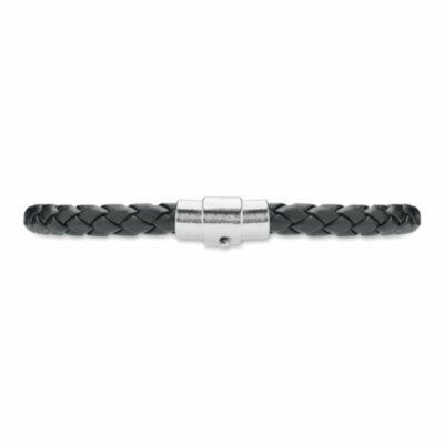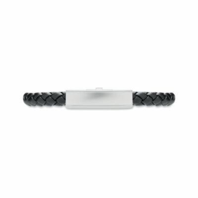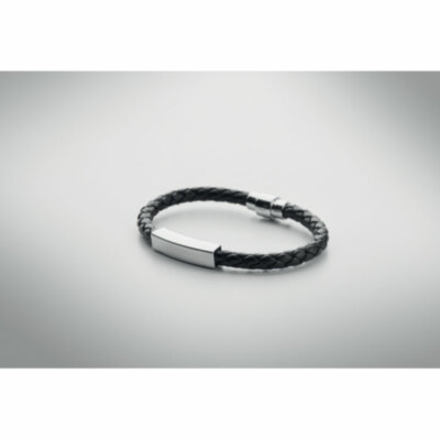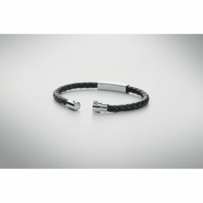 Brazalete trenzado de piel sintética con herrajes de acero pulido. Cierre de presión. Circunferencia de la muñeca: 19 cm.