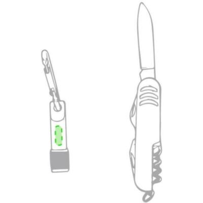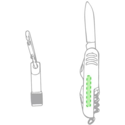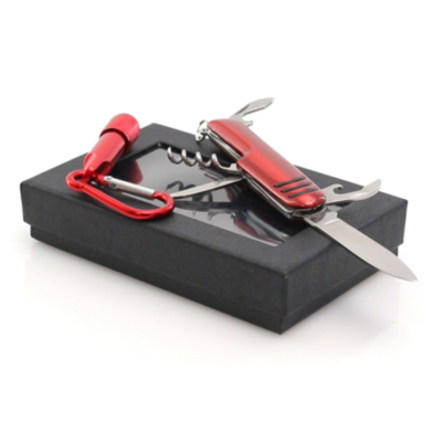 Set de aluminio de navaja multiusos con 7 funciones y linterna mosquetón. En variados colores y presentado en estuche individual con ventana y suave espuma interior troquelada. Pilas de botón incluidas.