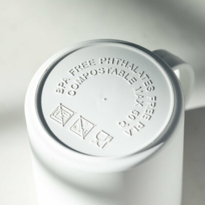 Taza de línea nature en PLA 100% compostable. 350ml de capacidad, de acabado sólido y libre de BPA. Producto fabricado con material PLA, procedente de materias primas renovables, con importantes propiedades como la versatilidad y la resistencia, destacando entre todas ellas la de compostabilidad.
