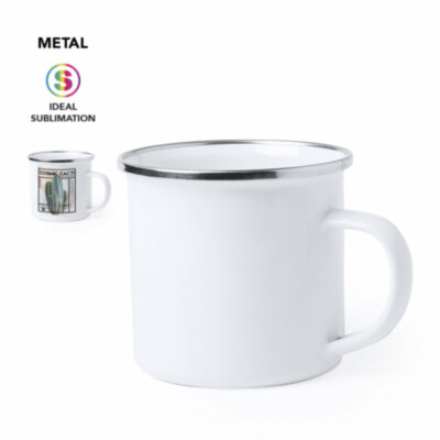 Taza metálica de diseño retro y 380ml de capacidad, con pequeñas imperfecciones para un aspecto vintage . Especialmente diseñada para marcaje en sublimación, con elegante anilla cromada y presentada en caja individual.